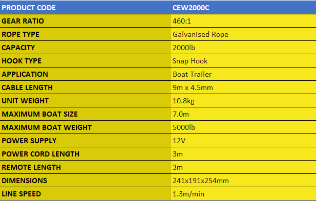 A quick release bracket for easy attachment and removal to either the winch post or tow ball, along with an emergency crank handle and galvanised cable and snap hook. Electric motor rating of 12-volt, 25 amp and 300watt, with a rating of 1.3 meters per minute while under load.