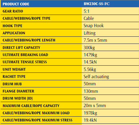 The Atlantic range of Stainless Steel Brake Winches are available in 2 different ratio sizes – 5:1 and 10:1 with load capacity ratings of 300kg to 500kg. This range of Brake Winches are suitable for pulling or lifting. The self actuating automatic braking mechanism ensures the suspension of loads and ‘jerk-free’ movement when lowering a load under pressure. The carbon copper fibre brake pads also ensure that a load is always secured under braking load.