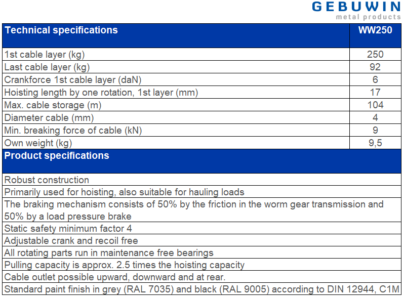Innovative and European-made, the Gebuwin worm gear hand winch range has been designed with a very basic transmission consisting of only a worm shaft and wheel. This enables significant friction loss and it also provides part of the winch braking system along with an integrated load pressure brake. The combination of the braking system and robust design results in a very safe hoisting and pulling winch.