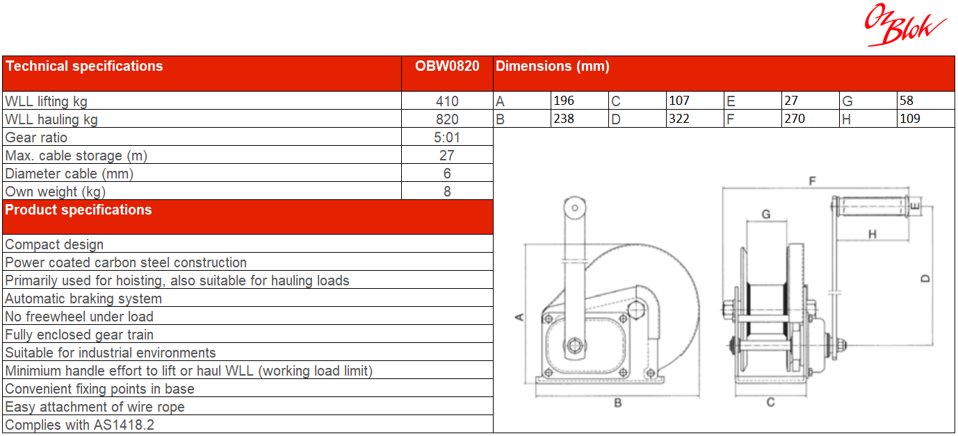 OzBlok Carbon Steel Load Brake Winch 410kg/820kg