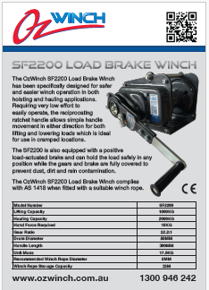 The OzWinch SF2200 Load Brake Winch has been specifically designed for safer and easier winch operation in both hoisting and hauling applications. Requiring very low effort to easily operate, the reciprocating ratchet handle allows simple handle movement in either direction for both lifting and lowering loads which and is ideal for use in cramped locations. The SF2200 is also equipped with a positive load-actuated brake and can hold the load safely in any position while the gears and brake are fully covered to prevent dust, dirt and rain contamination.
