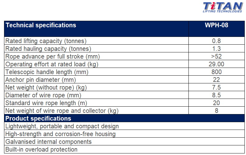 Titan rope pullers are available in 3 capacities including 800kg, 1600kg and 3200kg. Extremely versatile to use over long distances, they can be used in horizontal, vertical or angled positions.