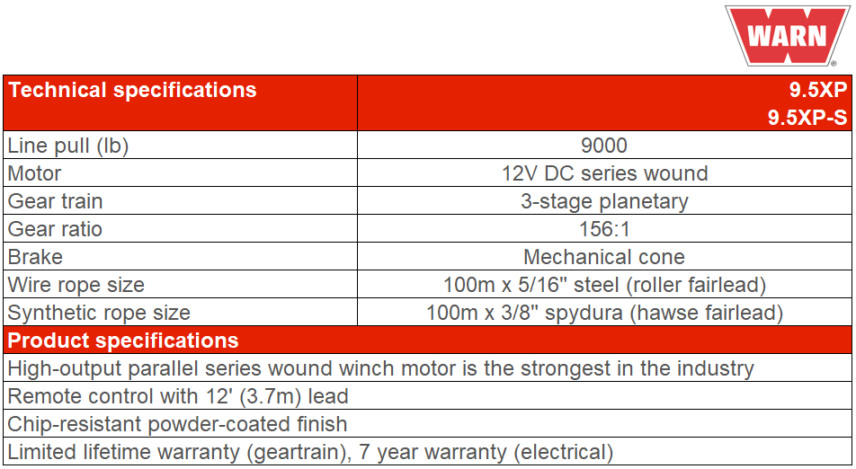 The fast, powerful Warn 9.5XP extreme performance is designed for the serious off-roader who demands a Winch that will perform under the most extreme conditions in the world. With 9,500 Pound. Of pulling power and the fastest line speed of any Warn Winch under load, the 9.5XP delivers extreme performance that eats up the competition even in competition. The 9.5XP Winch features the high output parallel series wound Winch motor that's the strongest and most durable in the industry. The 6 Horsepower motor, 3 stage planetary gearing and extended duty control pack work in sync to tackle the most demanding pulls. Full face contact drum seals, motor, and end housing gaskets deliver extreme-duty water resistance. A high gloss, chip resistant powder coat finish over primer coated alloys affords superior corrosion resistance