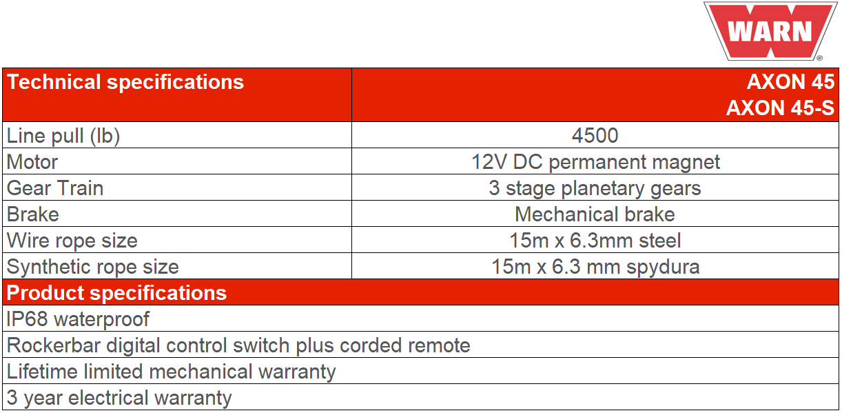 With the all-new AXON™ lineup, Warn has taken winching to the next level by combining a powerful motor and first-of-its-kind digital contactor into one unit called a Motactor™. The Warn Motactor™ increases performance, drops installation time, and provides never-before-seen levels of performance and feedback to the user. Tech is nothing without durability, so we made AXON the most durable powersports winch ever. All-metal construction, waterproof sealing, and increased structural rigidity are made for extreme environments. It’s smart, tough, and perfect for a wide range of powersports vehicles. Available in 3,500, 4,500, and 5,500 pulling capacities, with a choice of steel or Spydura™ synthetic rope.