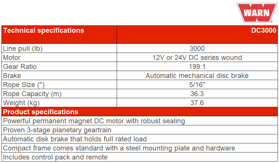 Warn DC3000 12/24V DC Electric Hoist Includes Control Pack and Controller 3000lb