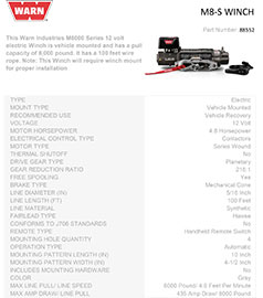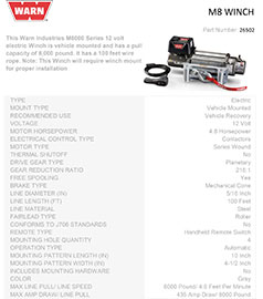 The M8 winch has been trusted by off-roaders for over twenty years. This 8,000 lb. capacity winch offers outstanding reliability and value. Its low-profile design allows for a variety of mounting options, making it perfect for most trucks, Jeeps and SUVs.